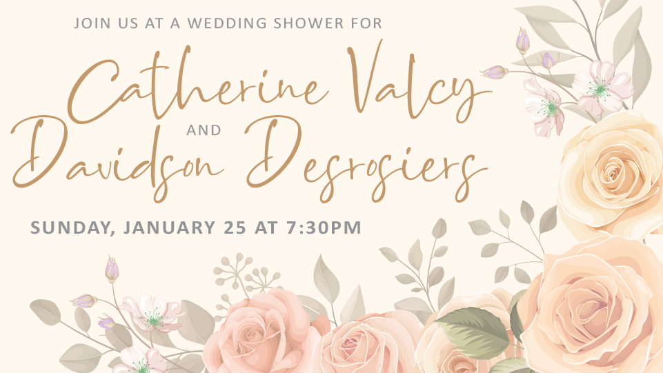 Join us as we celebrate the upcoming wedding of Catherine Valcy and Davidson Desrosiers with them! Both women and men are welcome. The couple is registered at Amazon.ca.